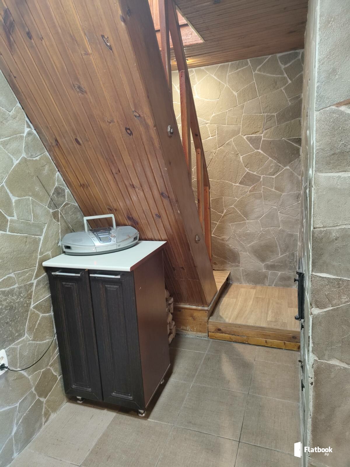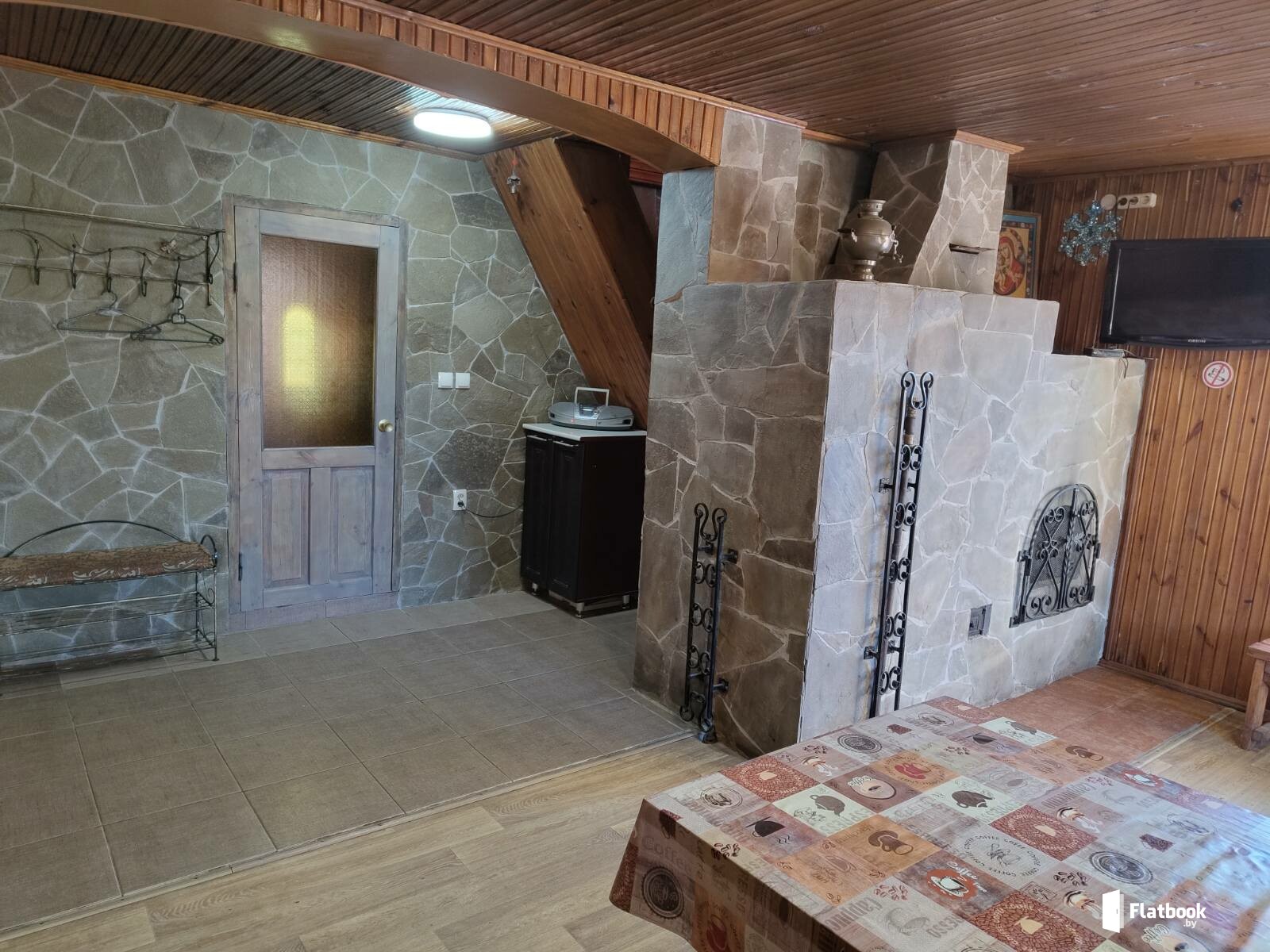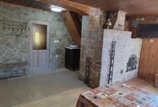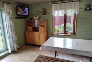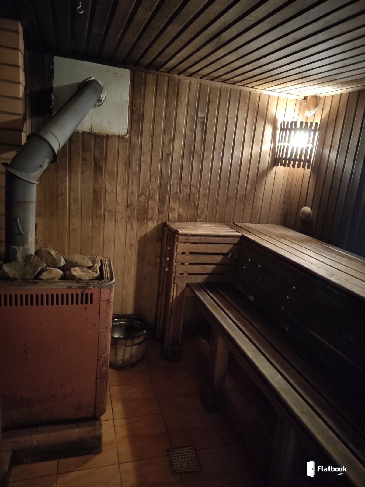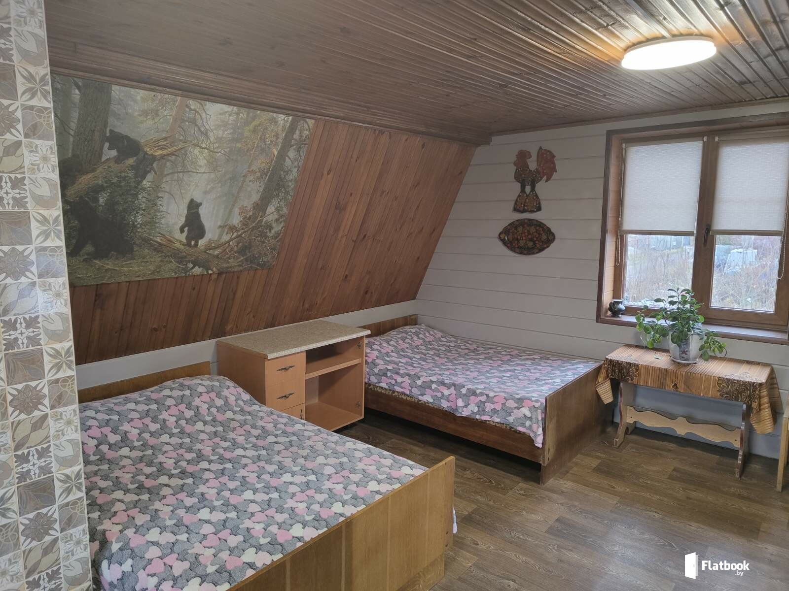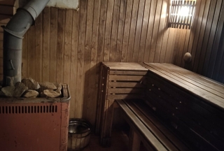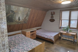 2-х этажный дом с сауной. На первом этаже прихожая, санузел, сауна с душем, комната отдыха, мини кухня с СВЧ печкой, эл.чайником, холодильником, комплект посуды на 8 человек, телевизор. На втором этаже спальные места. Всего 8 спальных мест 2+2+2+2. Интерьер в виде охотничьего домика. Участок огорожен высоким забором, парковочные места, видеонаблюдение, качели, спортивный и детский уголок, много зелёных насаждений и различных архитектурных строений. Рядом с домом большая беседка на 12 человек с крытым мангалом.
